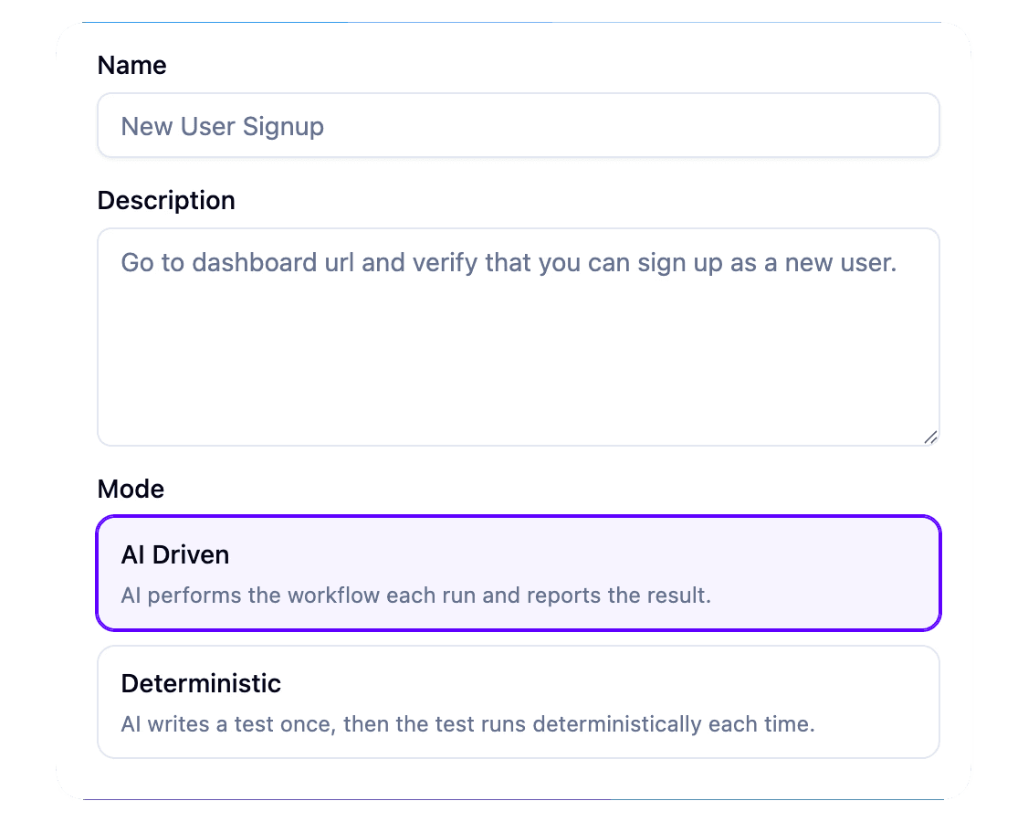 Simply describe in natural language what you want to test.